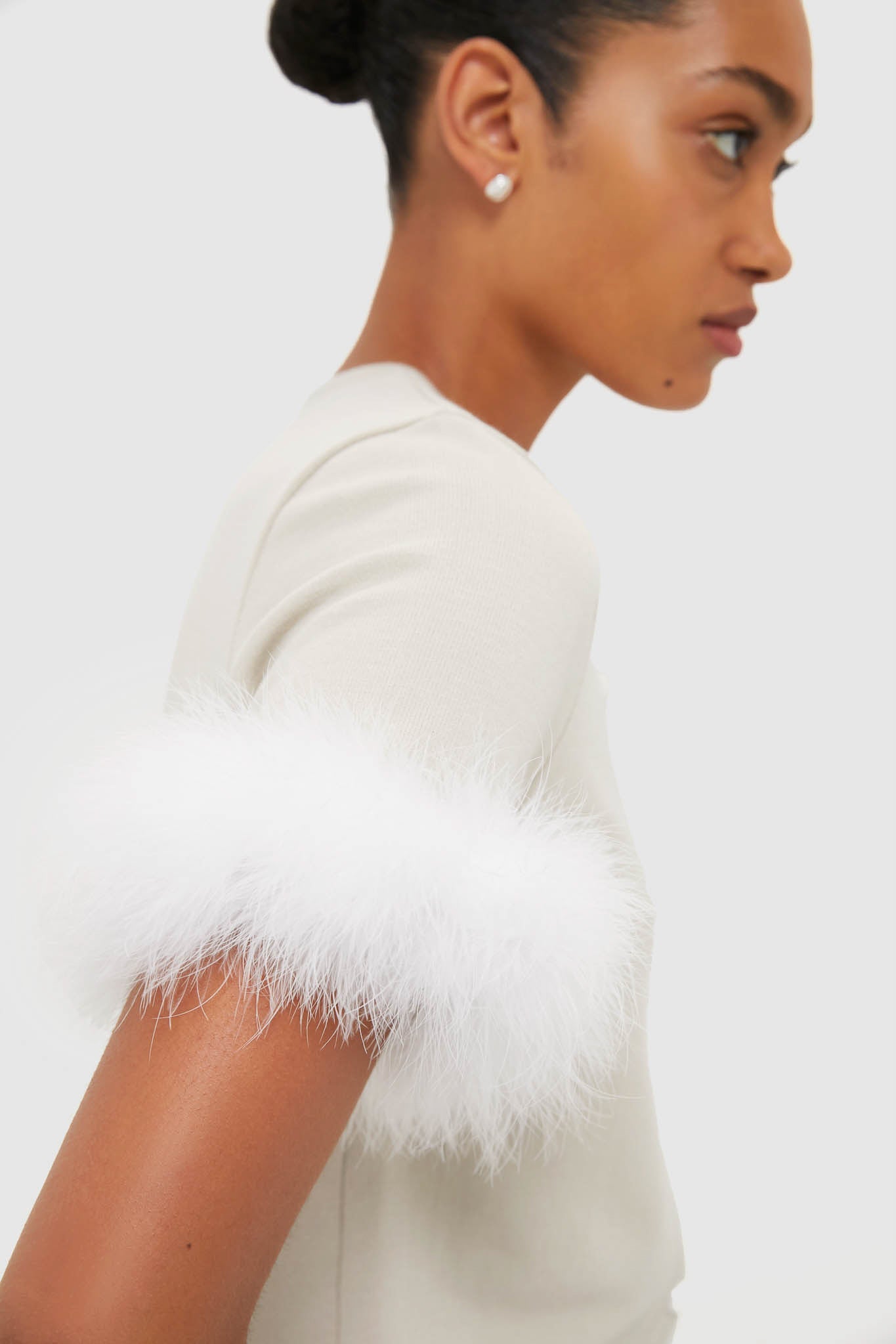 Crafted from soft beige viscose knit in a relaxed silhouette, this short-sleeve cardigan shines with pearl-like buttons and detachable feather cuffs. Pair it with trousers, pajamas, or loungewear for a versatile look that effortlessly balances everyday comfort with festive charm.