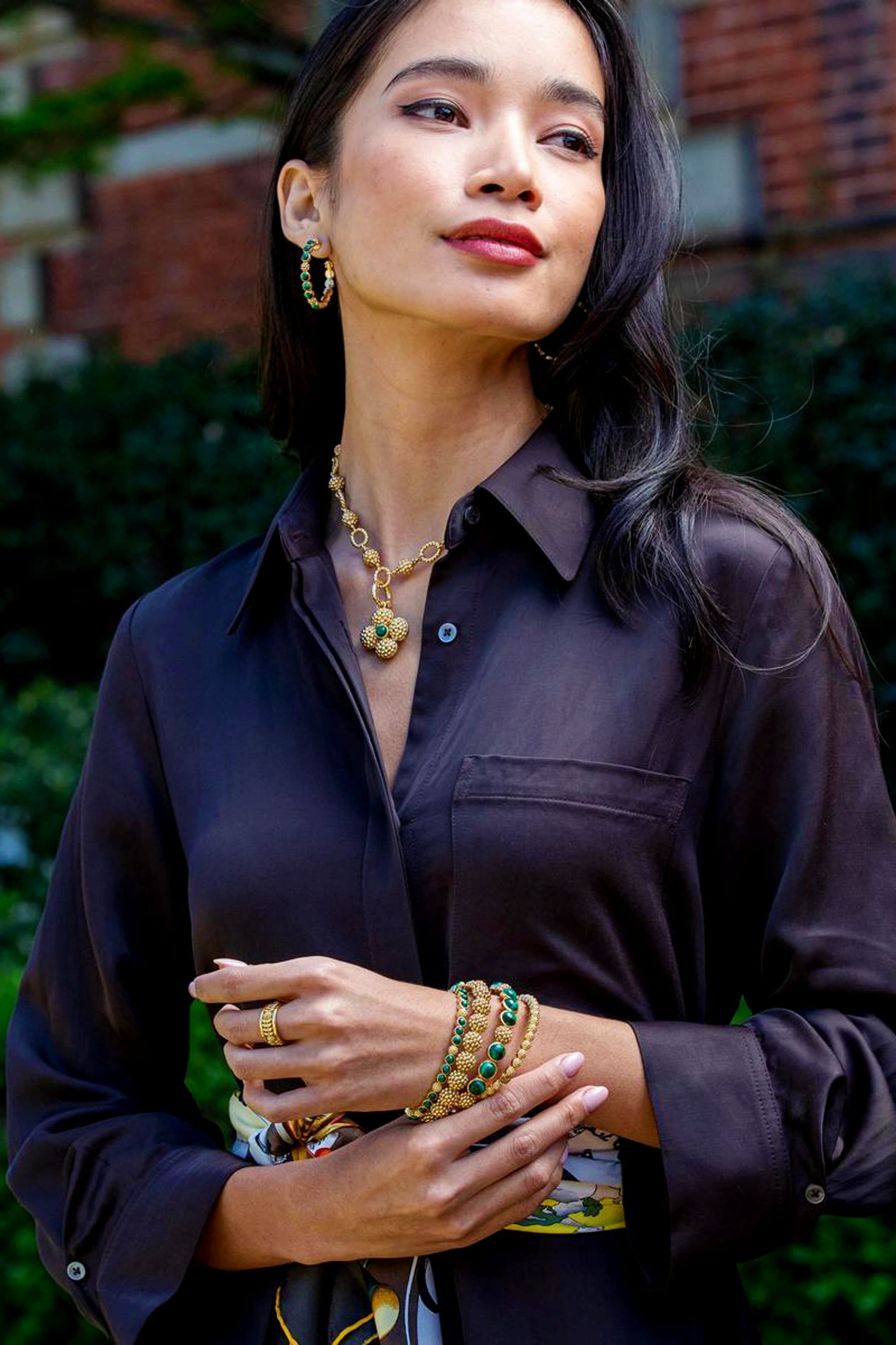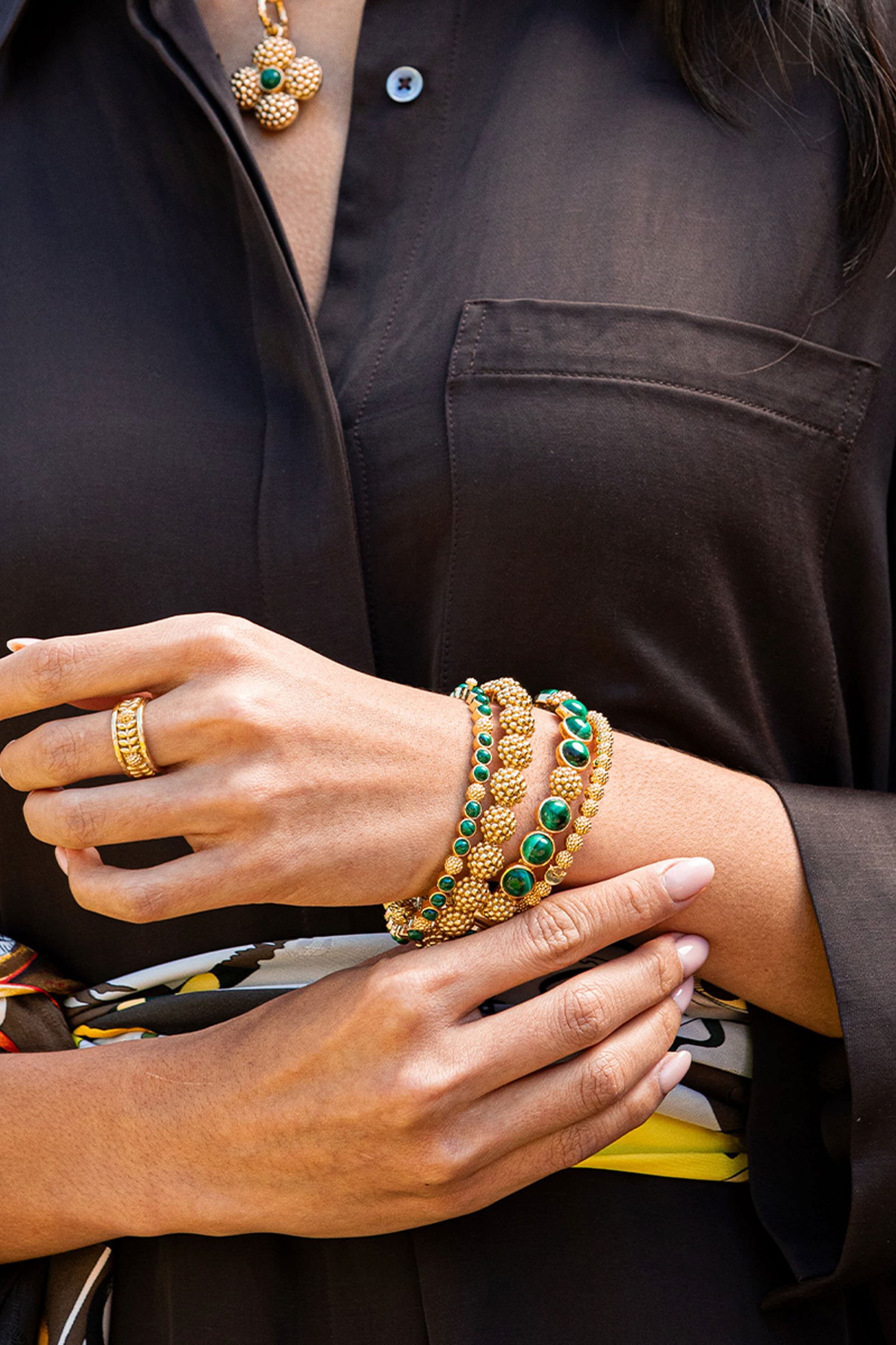 Trios of gorgeous green malachite are united by a sprinkling of golden berries to create this refined bangle that adds a fabulously feminine flourish to any ensemble—whether you’re running a meeting, hosting a dinner party or jet-setting to Monaco.