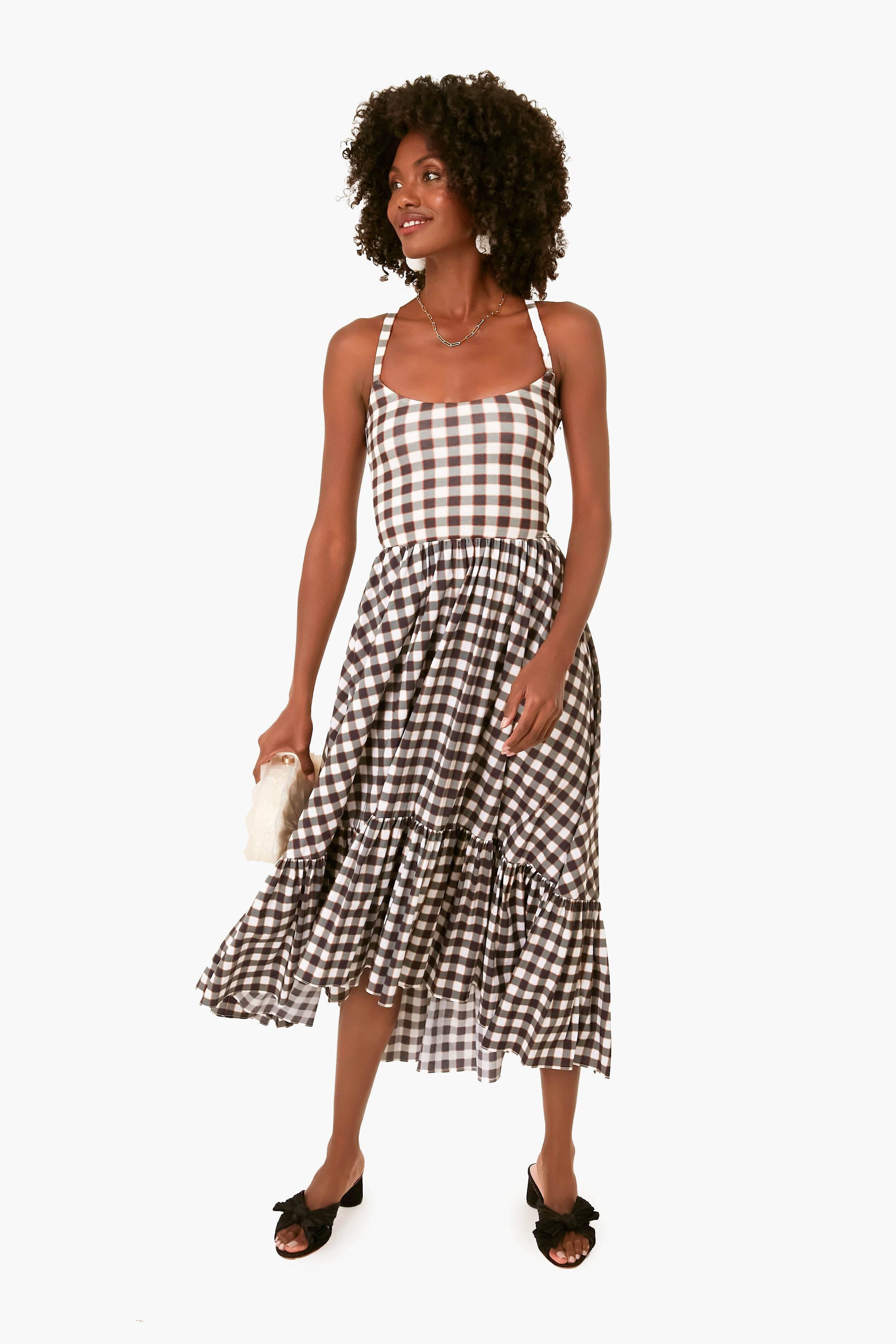 The Black Check Plaid Veronica Dress is a timeless silhouette that will never go out of style. With a form-fitting, scoop-neck bodice balanced by an A-line midi skirt, it is a quintessential feminine shape that flatters so many body types. It’s cut from a breezy stretch-cotton, and complete with a large ruffle hem. Pair with sandals and sunglasses to wander through a new city, or with statement earrings and wedges to dinners al fresco.