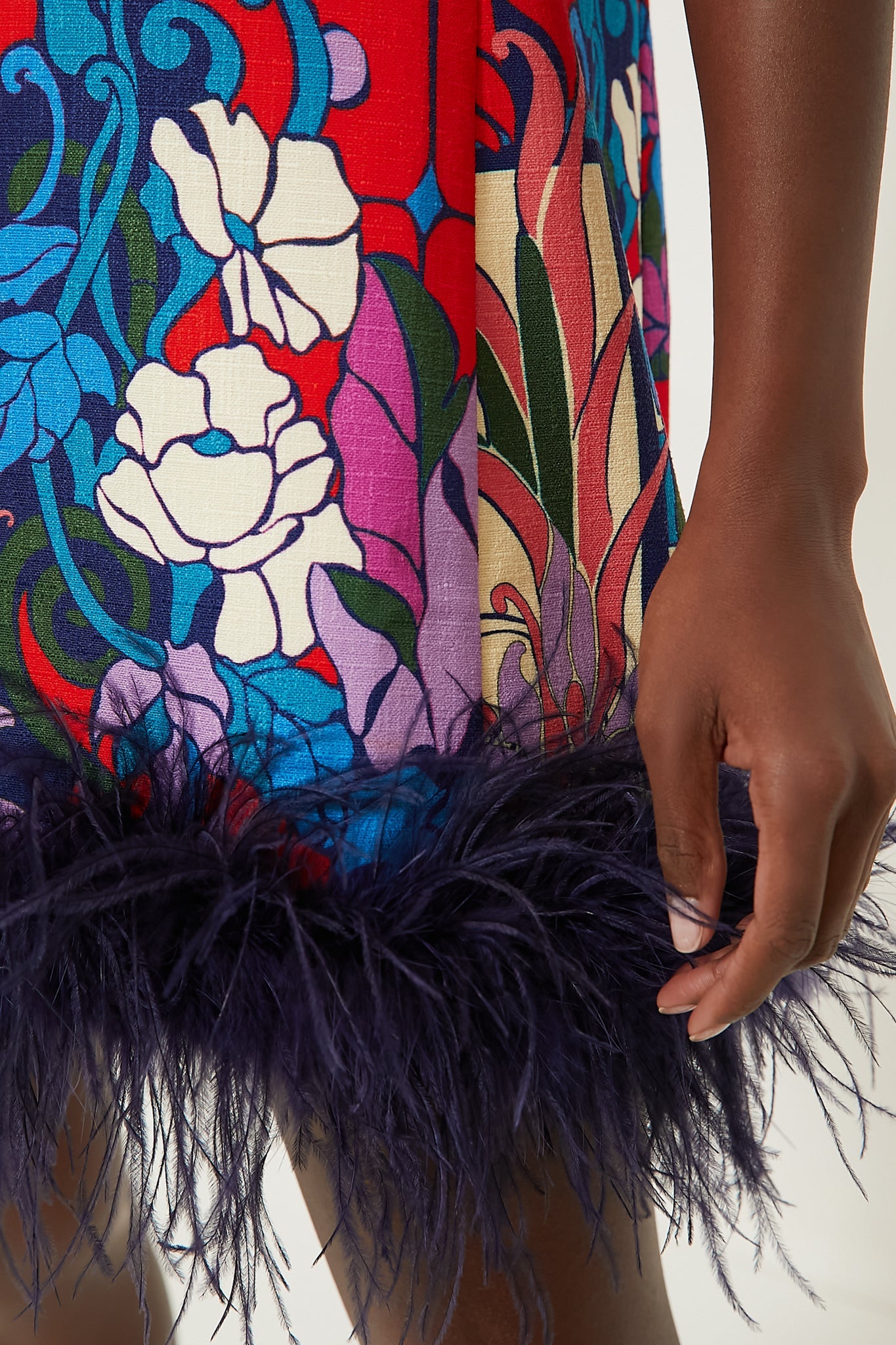- Feather-trimmed hem