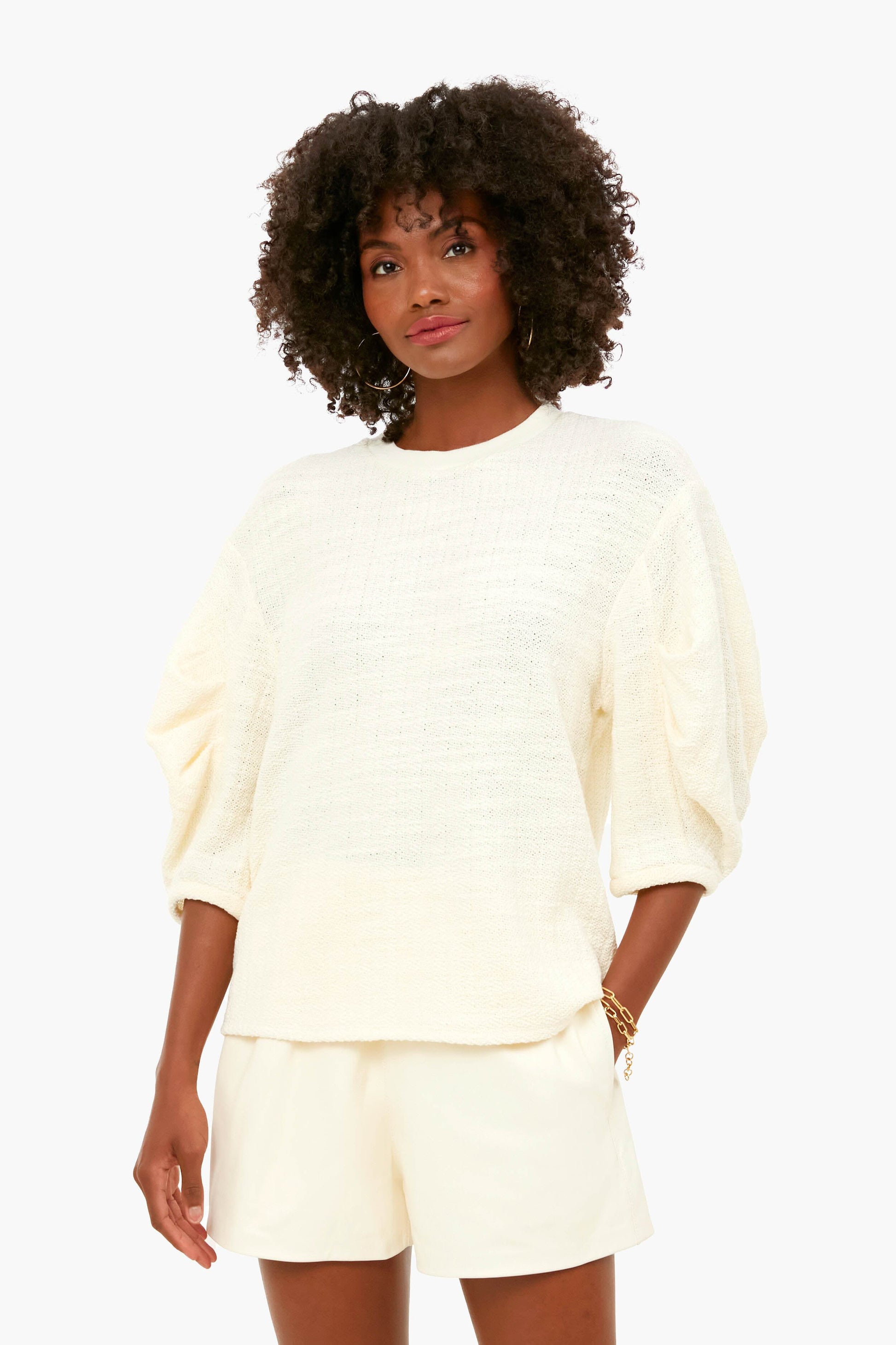 The Cream Handspun Knit Pleat Sleeve Top is made from an Italian jersey fabric and features voluminous sleeves with the brand’s signature cocoon shape. Ultra-chic in a neutral hue, it provides ease as your wardrobe transitions through the warmer seasons. This style can be paired back to jeans or white shorts for a monochromatic look.