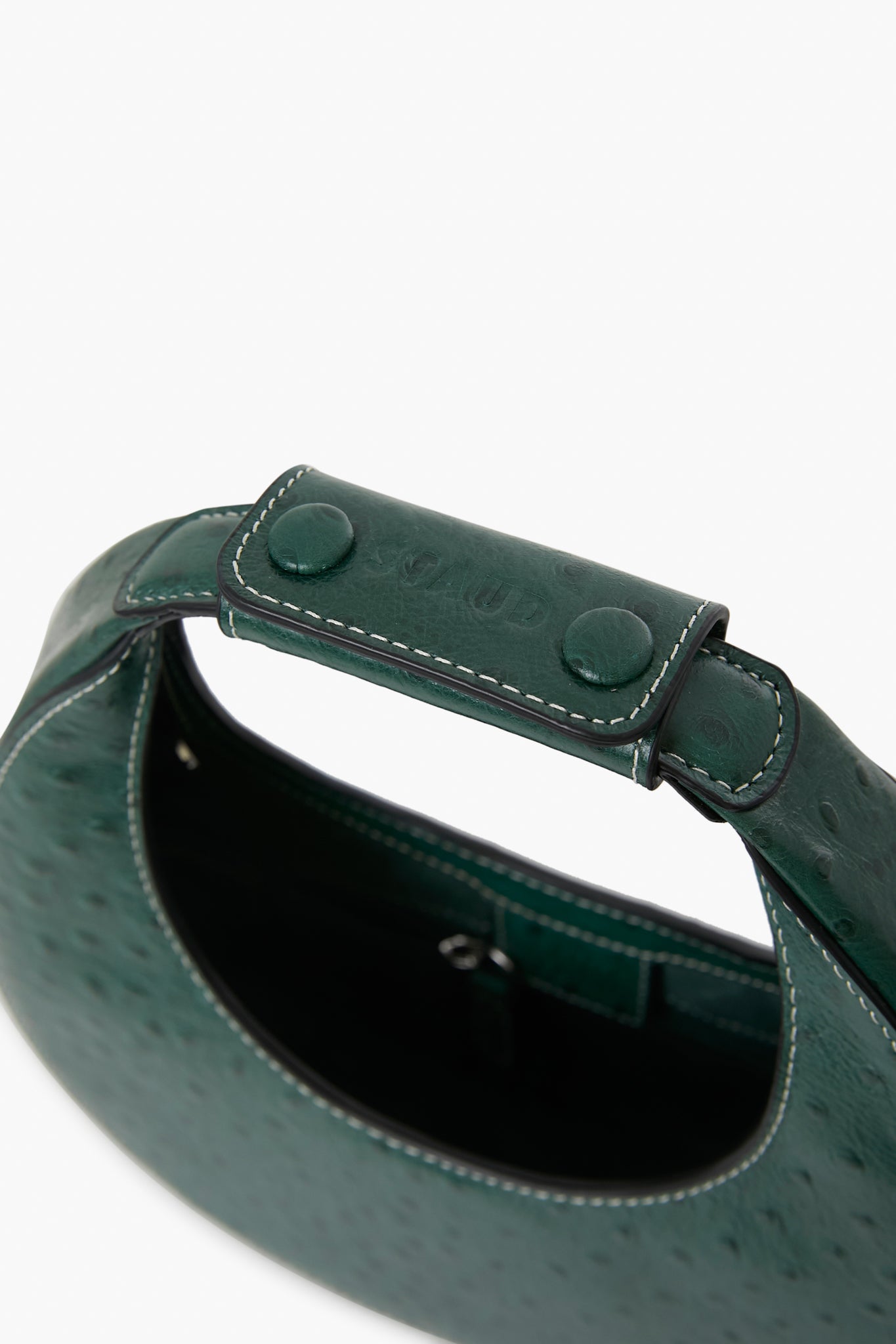 The Cypress Mini Moon Bag is a structured shoulder bag made from ostrich-embossed leather in an emerald hue. Practical and unique, this style pairs easily with neutral classics and bold day dresses.