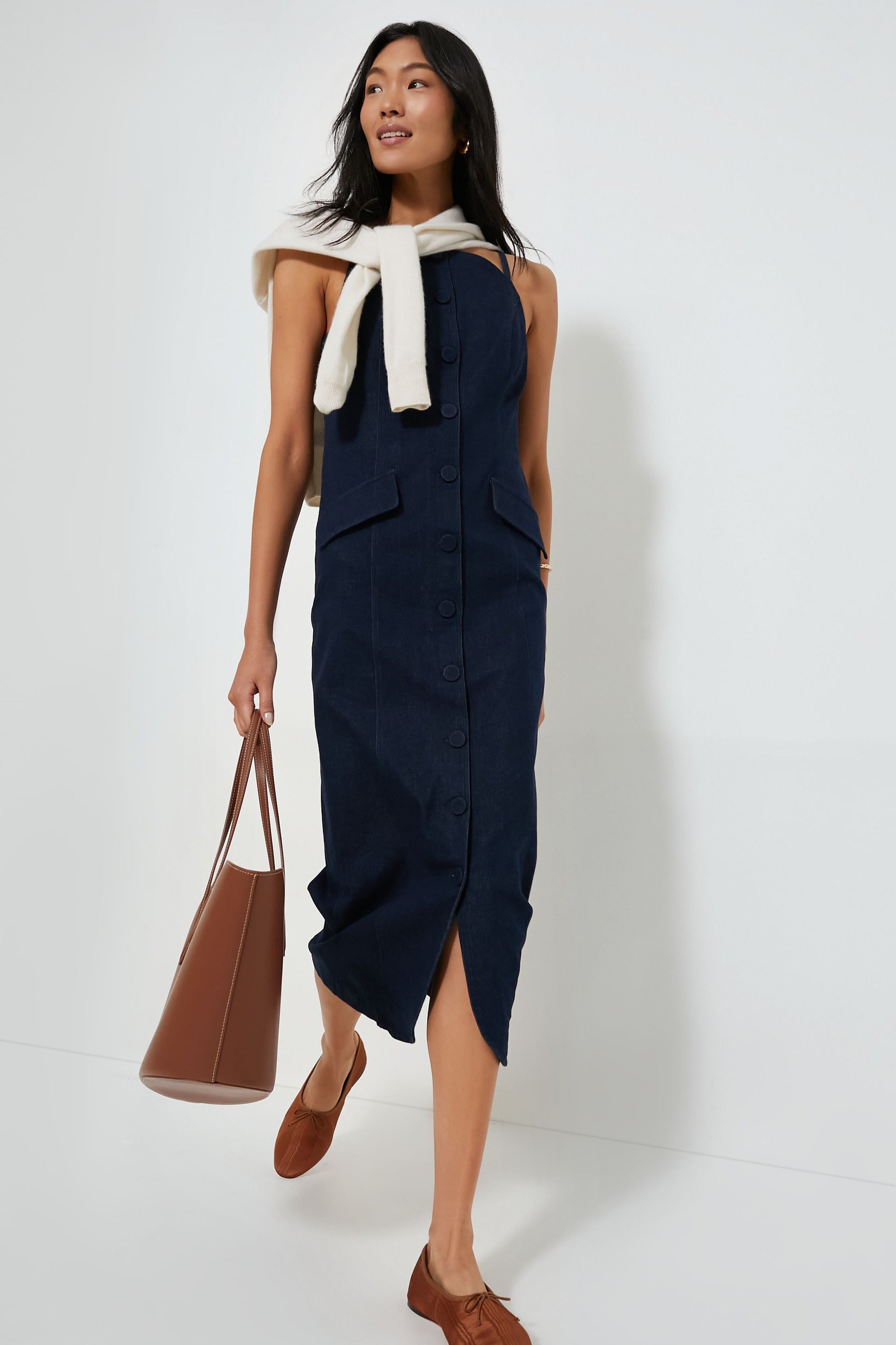 The Lilliana Dress takes a casual denim dress and upgrades it with chic and elevated details. This straight silhouette boasts a high curved neckline, a front button placket with self-covered buttons, and two front flap pockets. An easy closet staple, pair with sandals for a more casual look, or chunky heels for a more formal approach.