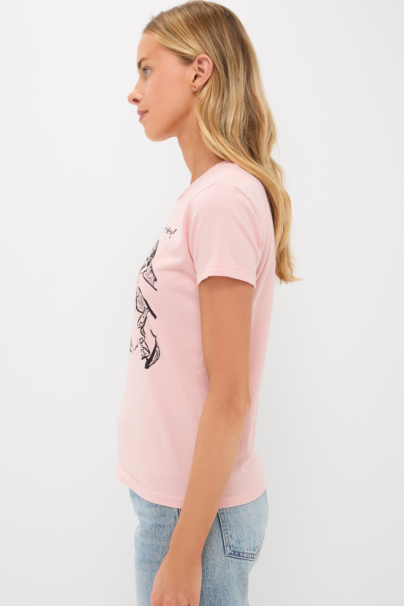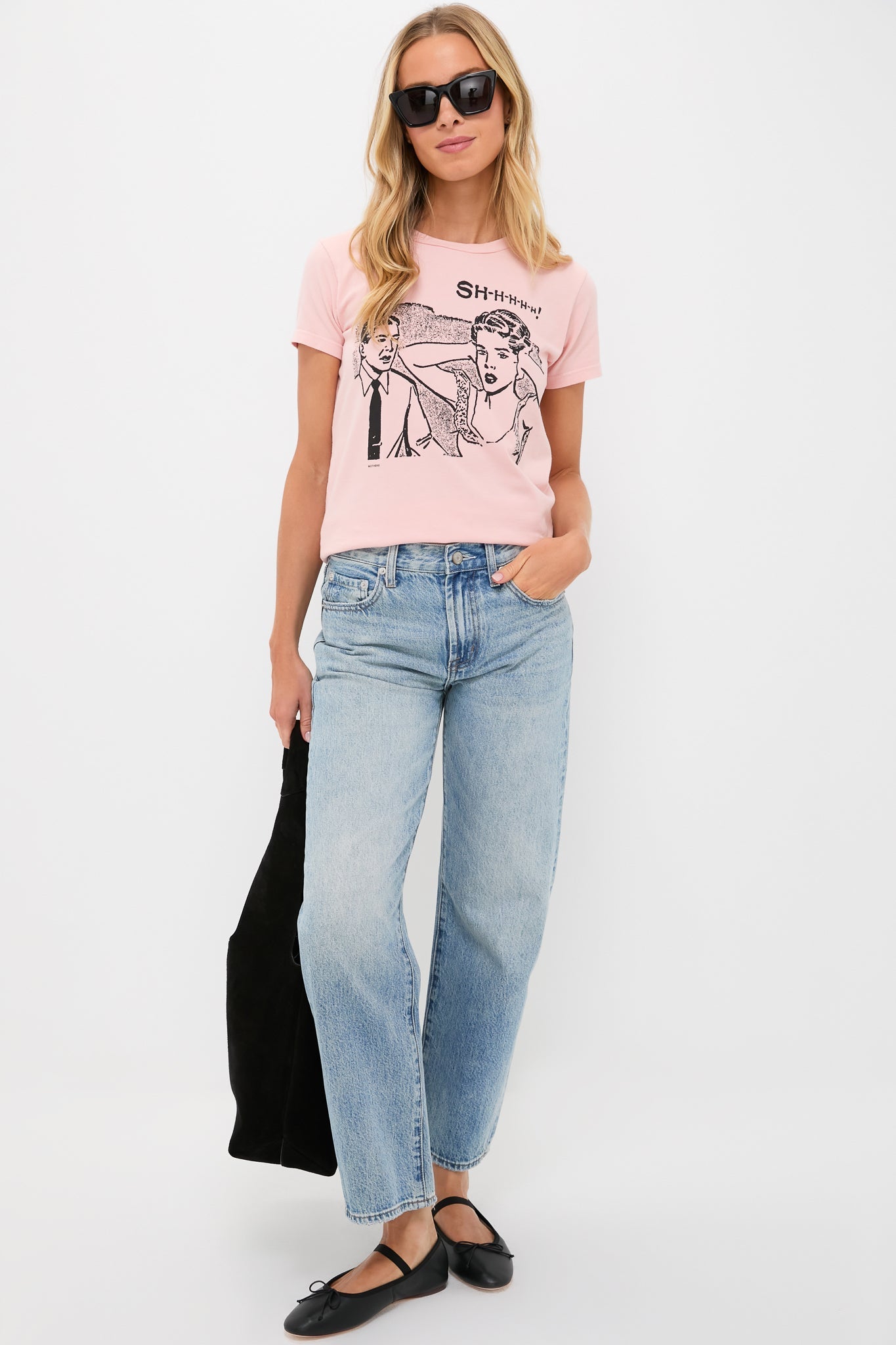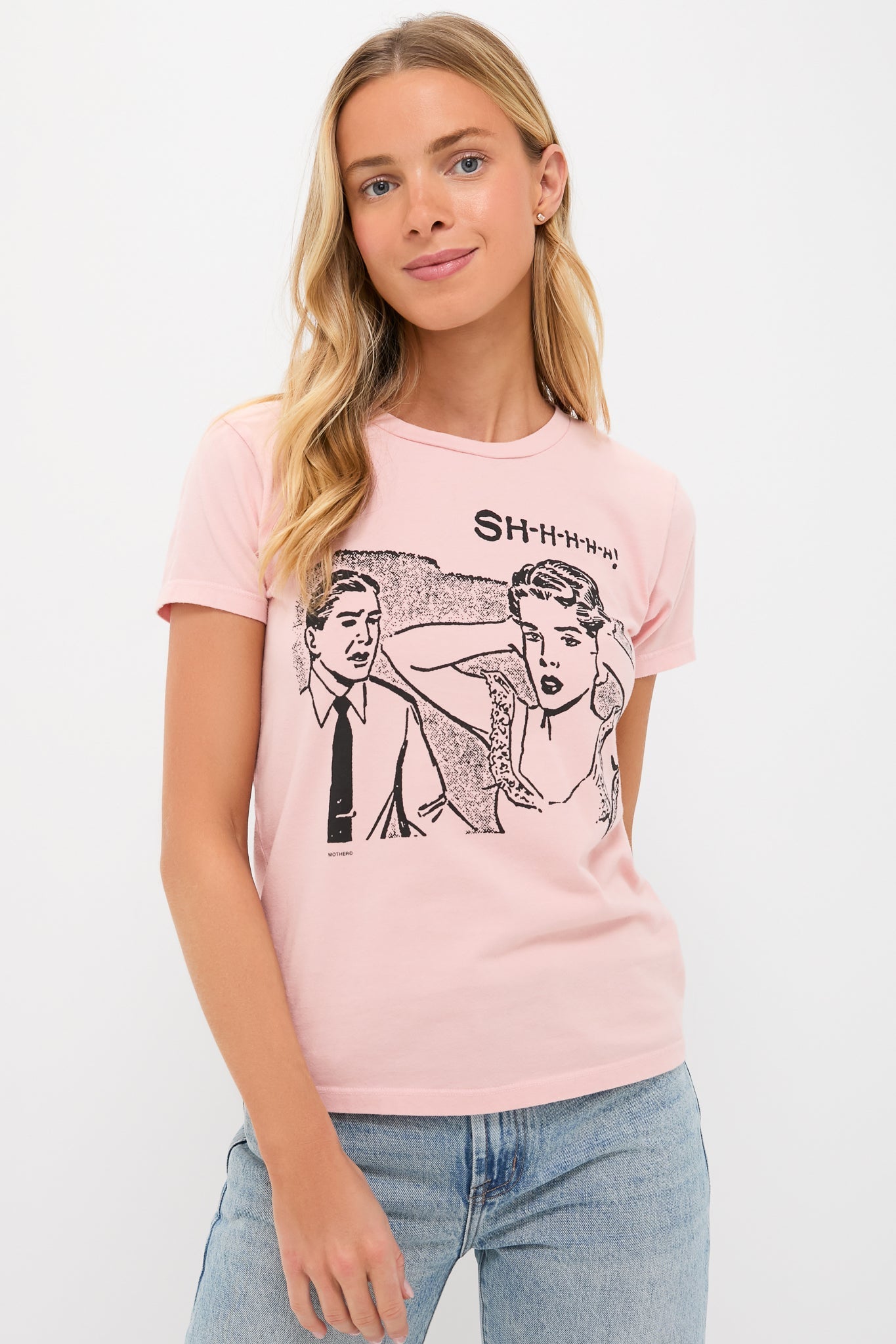 A soft crewneck with a slim fit for a vintage look and feel. Made from a stretch cotton blend in pale pink, The Boxy Goodie Goodie in Shh features a black graphic on the front, to say what were all thinking. Pair with jeans, flats, and a tote for a casual look.
