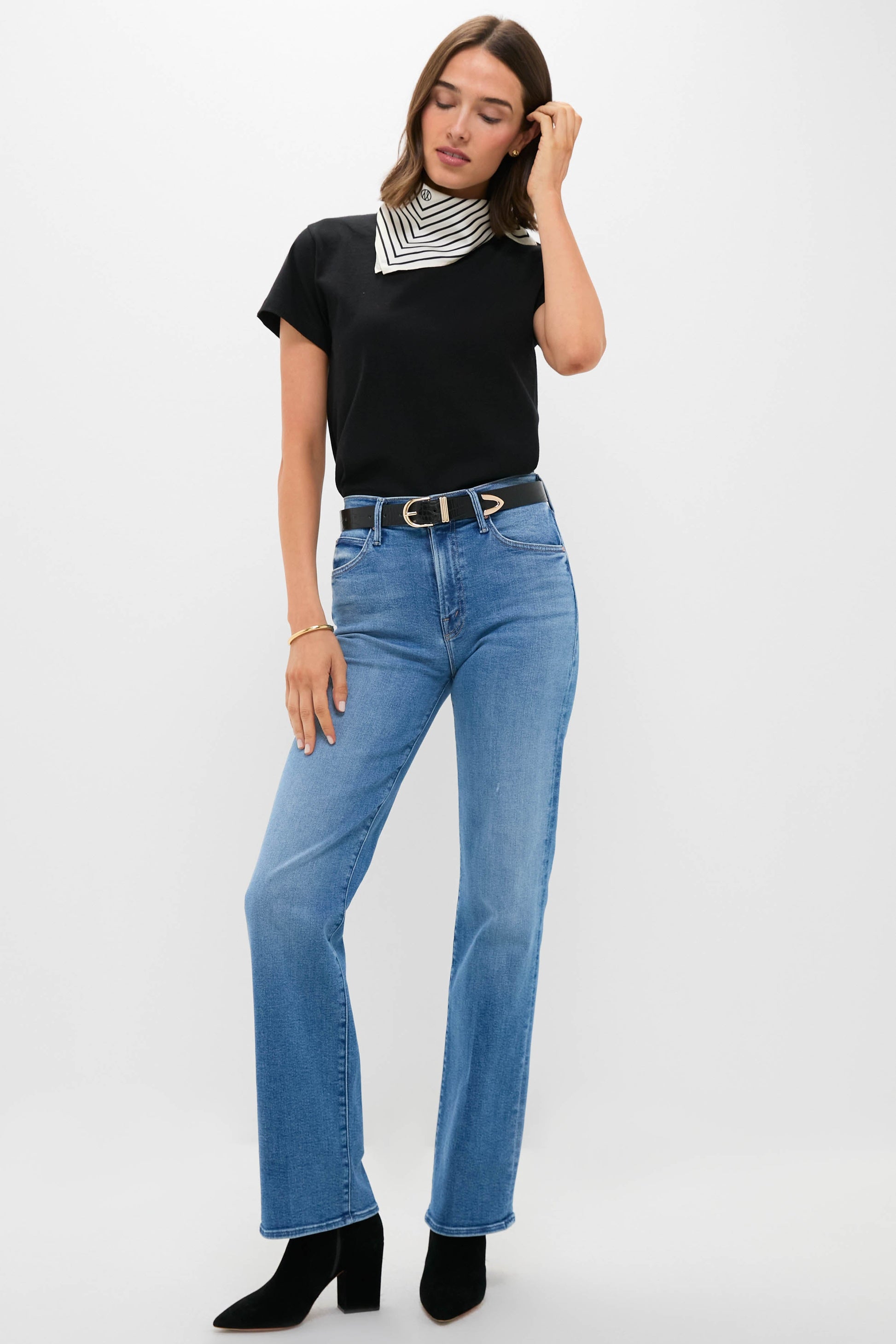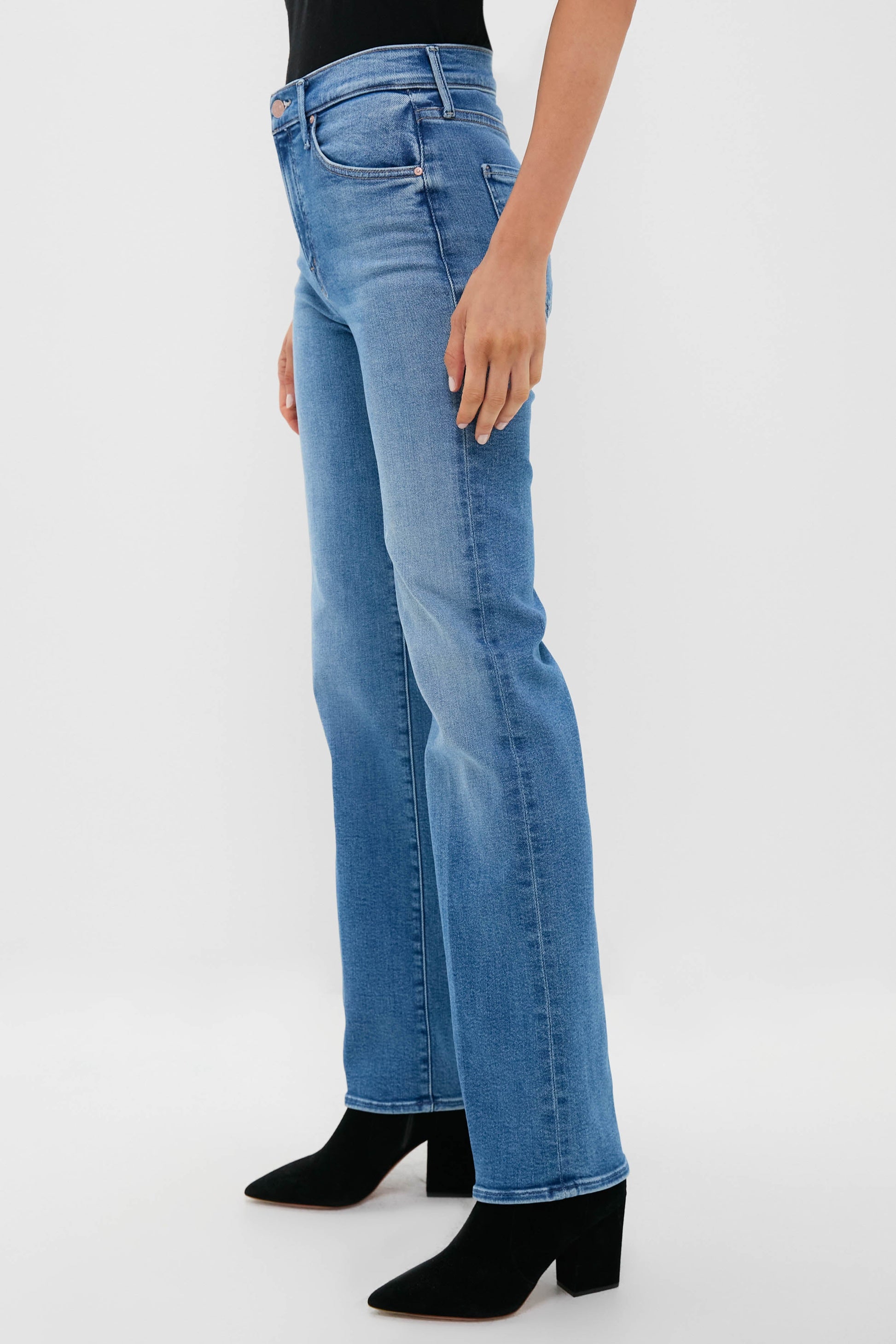 With a high-rise, straight leg, and a clean hem, the Fan Favorite The Kick It is sure to please. Cut from stretch denim, Fan Favorite is a mid-blue with whiskering and fading at the knee. Pair with a tee or sweater, boots, and your favorite fall accessories for a pulled together look.