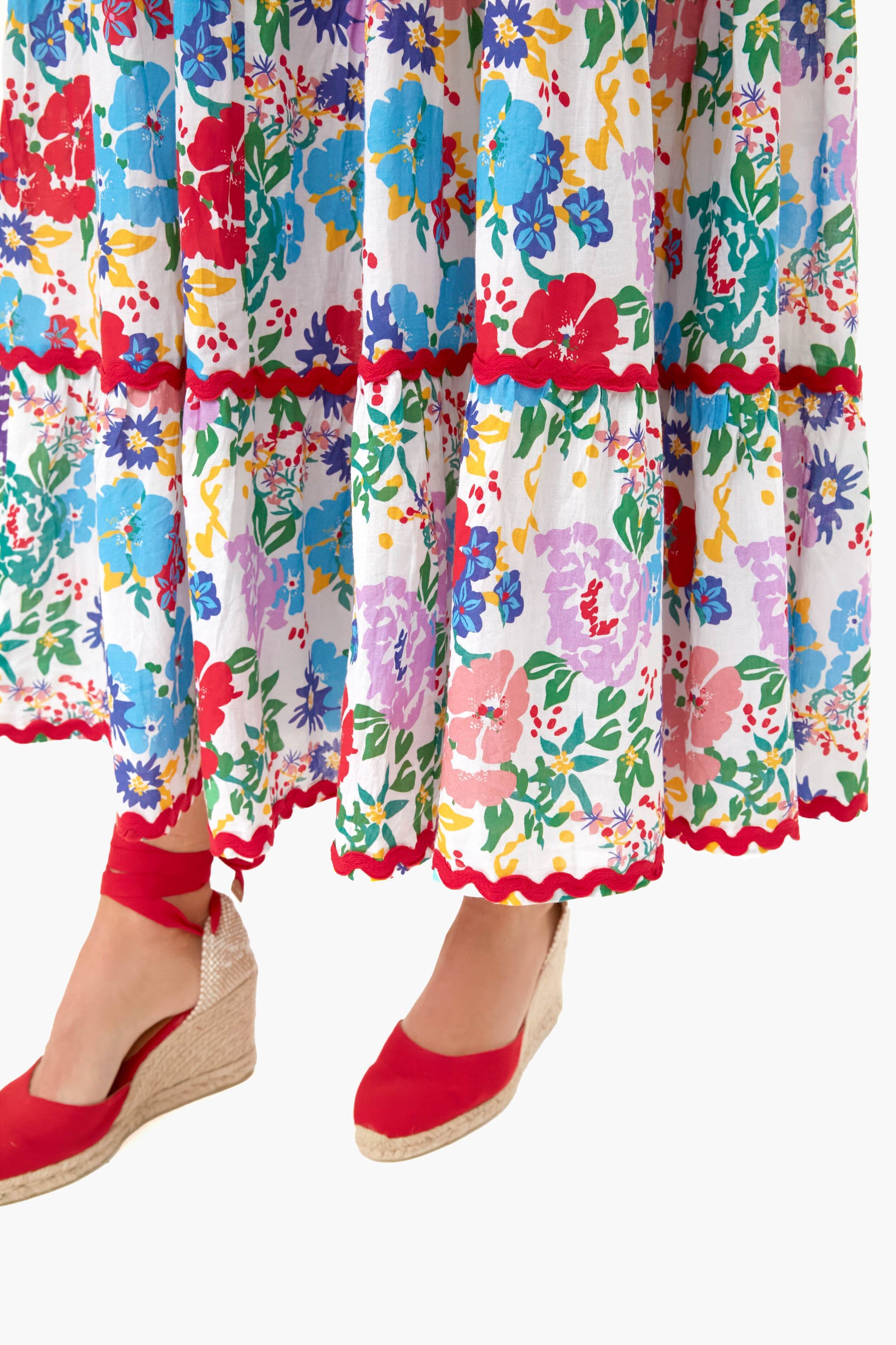 The Fantasia Valley Dress features a cheerful, colorful print in a breezy maxi silhouette. Featuring a halter neckline with tassel ties, red ric rac trim, and a tiered skirt, this style is unique and fun. Pair back to wedges and gold jewelry from the office to dinner al fresco.