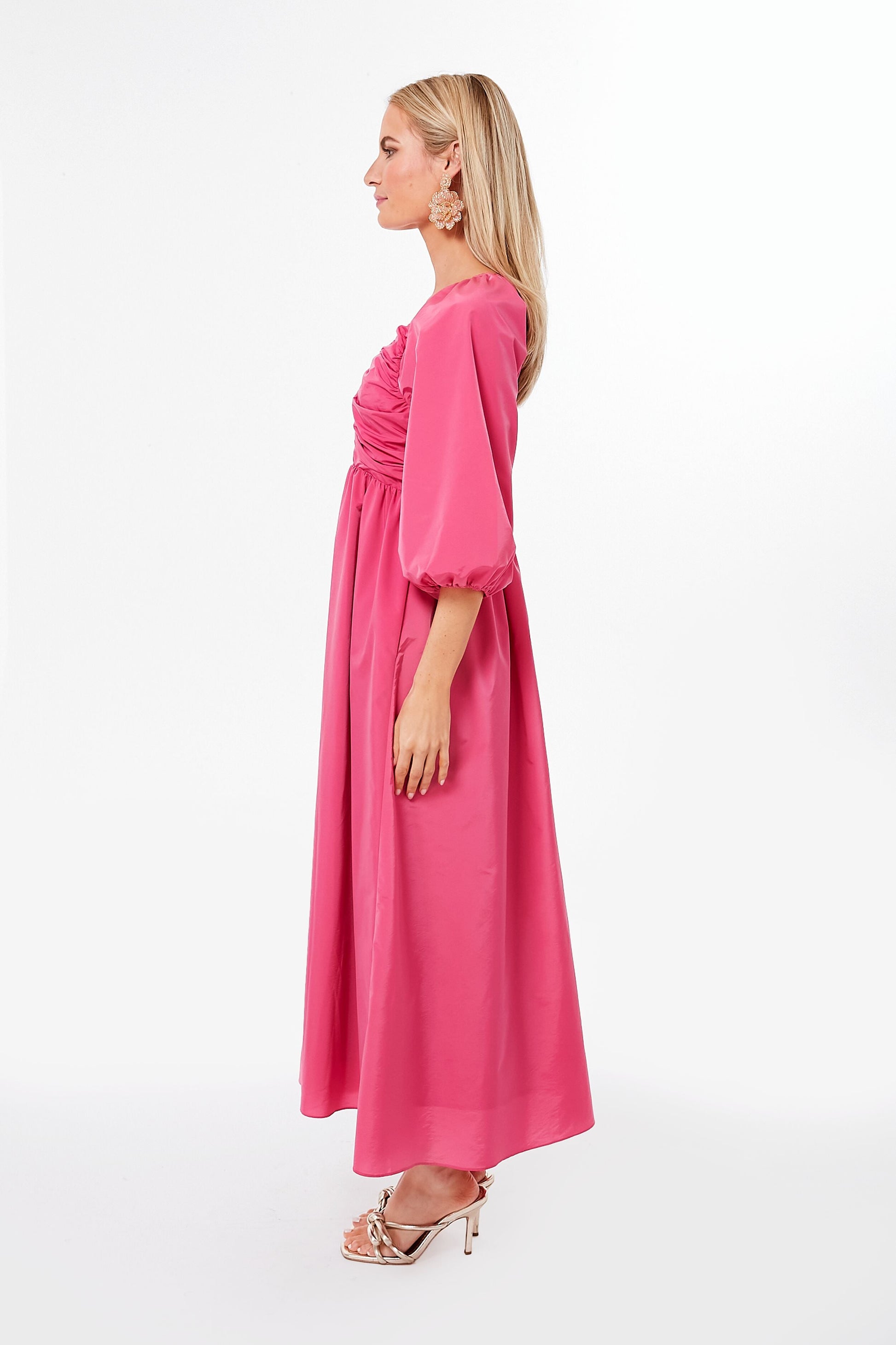 The stunning silhouette of the Gia Dress is elevated by eye-catching pink fabric with a glamorous hint of sheen. Featuring ruched detailing at the neckline and oversized sleeves, this fuchsia frock is perfect for weddings, galas and soirees alike. We're wearing with strappy gold heels, color-coordinating jewelry, and a box clutch for a winning look, no matter the occasion.