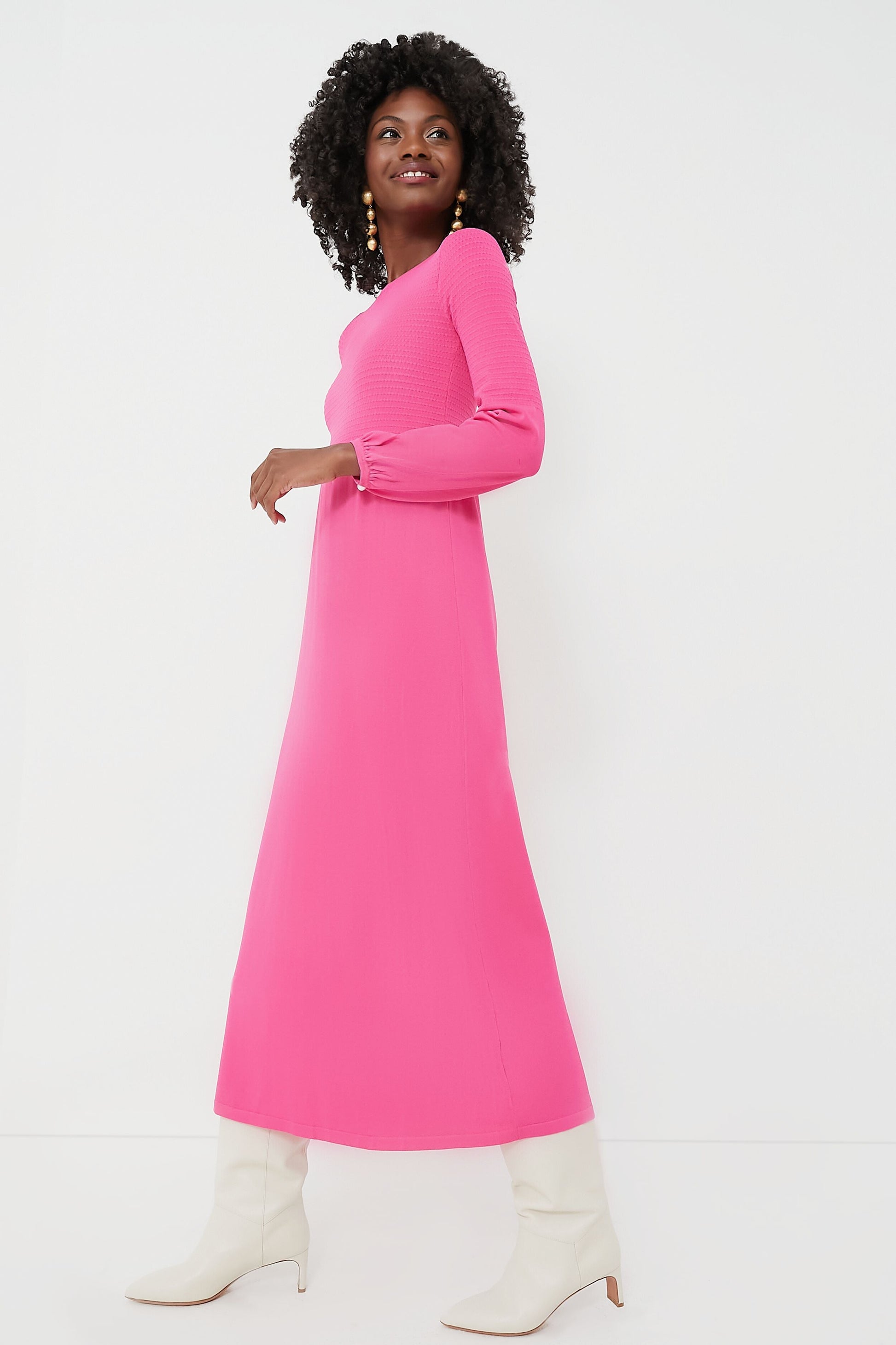 As cozy as a sweater as it is a chic dress, the Lennox will take you from clocking hours at the office to holiday cocktail parties with the quick switch of accessories. Crafted from a double knit fabric that's extra slimming and even more comfortable, this hot pink maxi is ready to be dressed up or down with its blouson sleeves and textured bodice details. Pair it with flats and gold hoops for effortless styling and a casual-cool vibe, or dress it up with heels and a clutch.