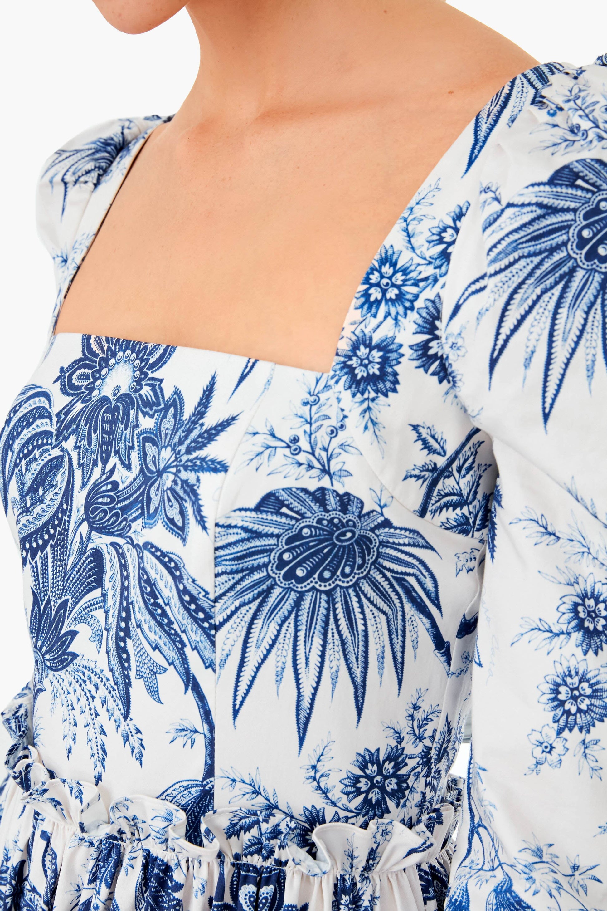 Turn heads in a cool-toned print with the Jacobean Toile Navy Blue Hill Dress. Featuring three-quarter length sleeves with a puff shoulder and ruffled seams, this midi is ready for anything. Pair with sandals and gold hoops for an easy daytime look, then change into heels and add a clutch for evening soirees and other occasions.