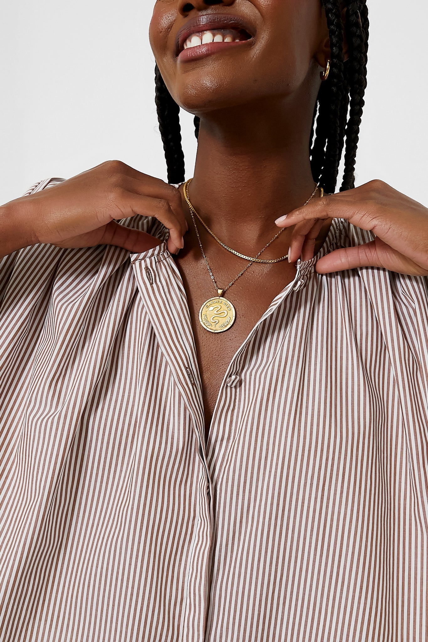 We are loving the Mahogany Stripe Darby Blouse for its homegrown feel and effortless wear. This adorable blouse features a notch V-neckline, short sleeves with contrast button cuffs, and ruching along the front and back yoke that gives it a full shape. Pair with denim and sandals for a coffee date, farmers market, or running errands look.