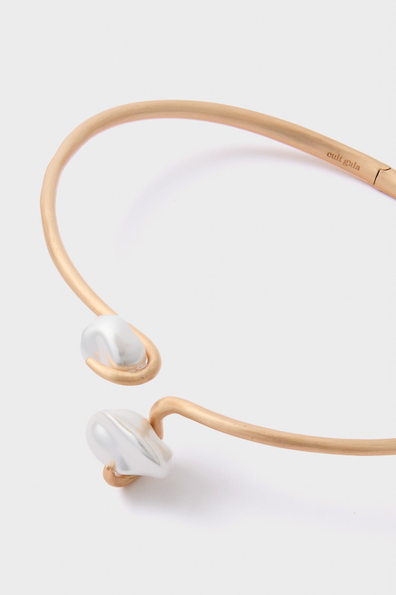 The Matte Brass Marais Choker features an open-front design accented with two elegant faux pearls. Perfect for date nights or gallery openings, it adds a modern, polished touch to any outfit.