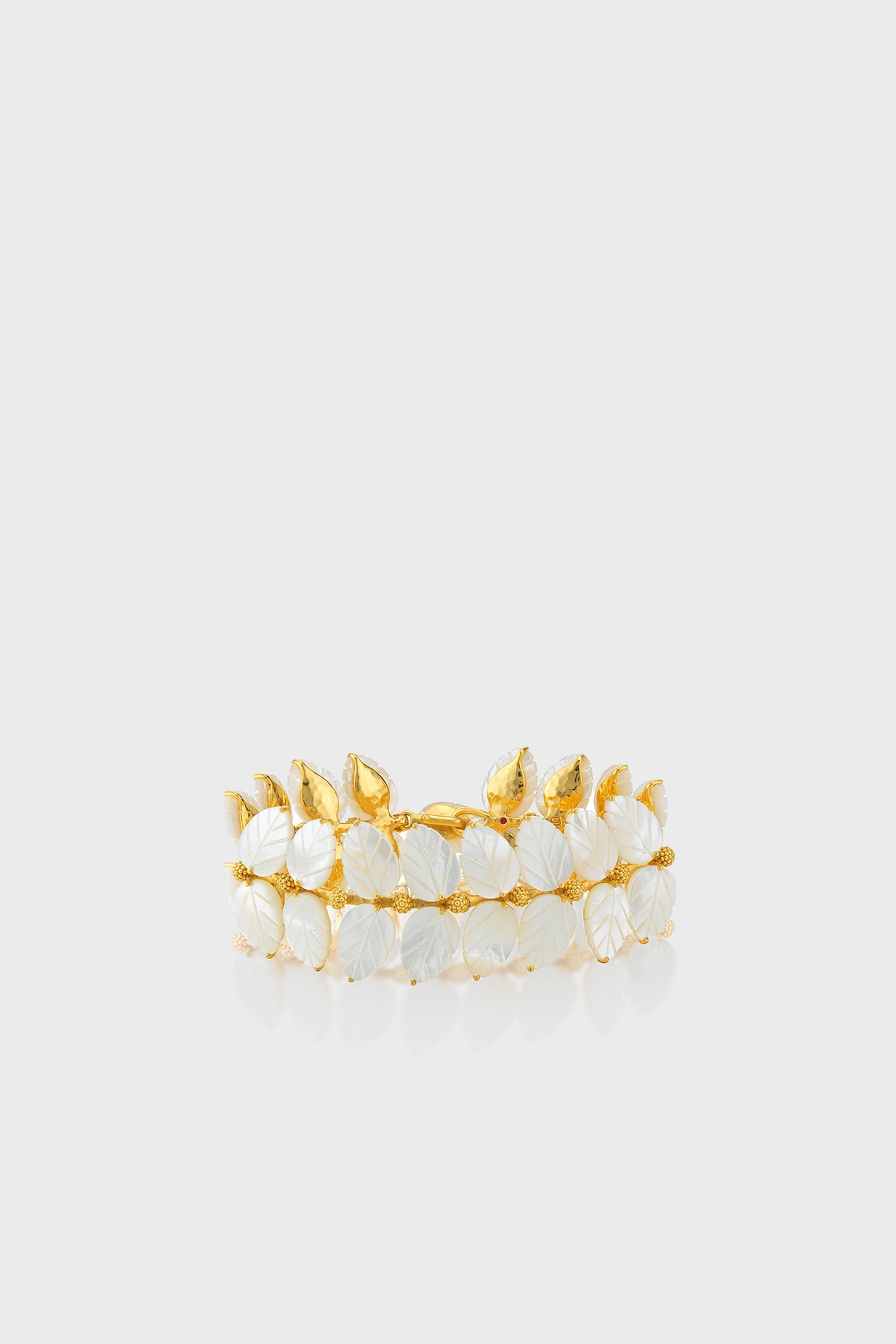 Entwine your wrist with a gorgeous vine of luminescent, hand-carved mother of pearl leaves to make a statement that is elegant, fresh with a splash of bohemian. Embellished with exquisite details like intricate carvings, golden berries and gilded leaf tips—the botanical beauty of this bracelet is the perfect outfit-finishing touch for any elevated occasion.