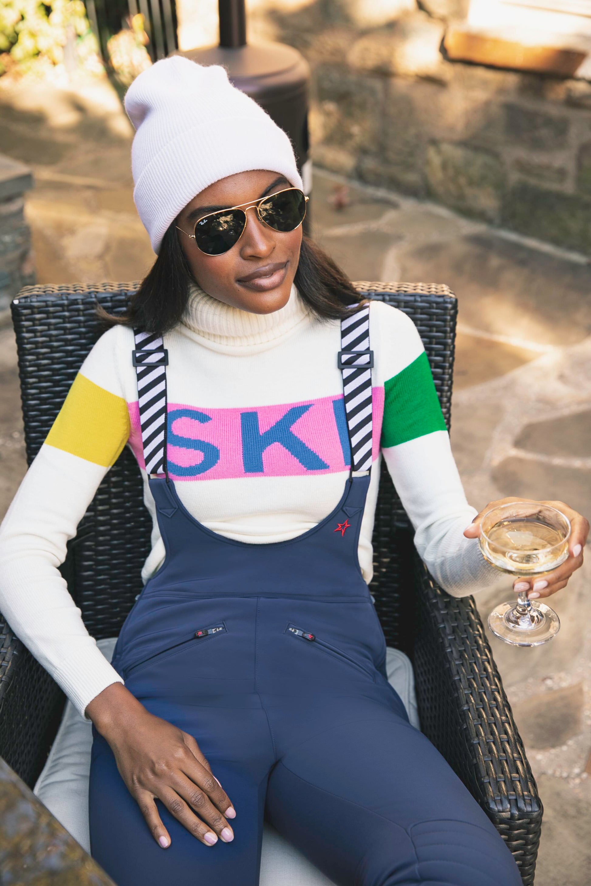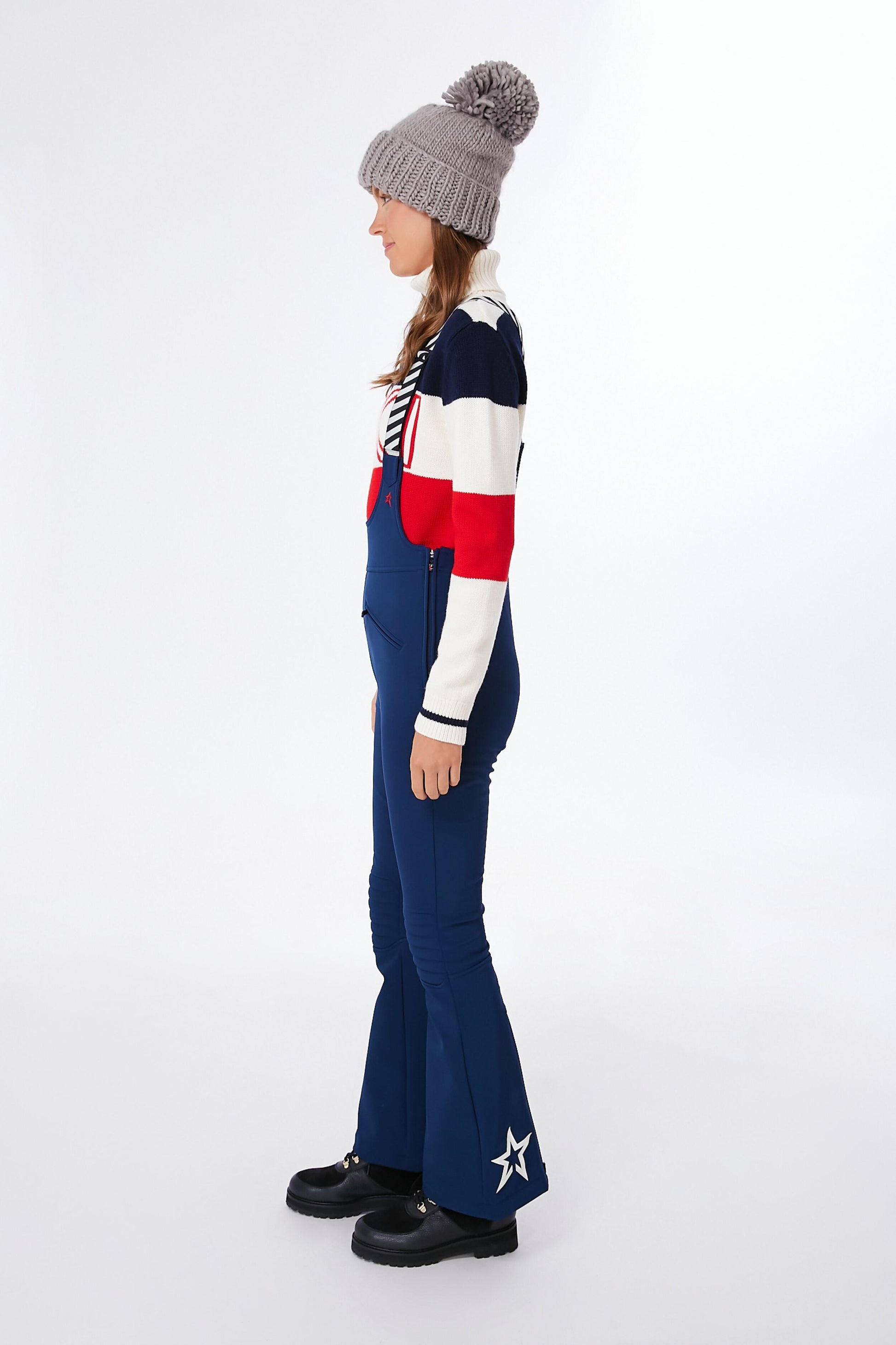 The Isola Racing Pant is a powder-fresh twist on a classic 1970s silhouette. Navy with bold black-and-white half chevron stripes on the brace, they are super breathable and waterproof, complete with four-way stretch for moving like a pro. This style has a fleece lining for the ultimate warmth and chic braces for steep runs (or long lunches).