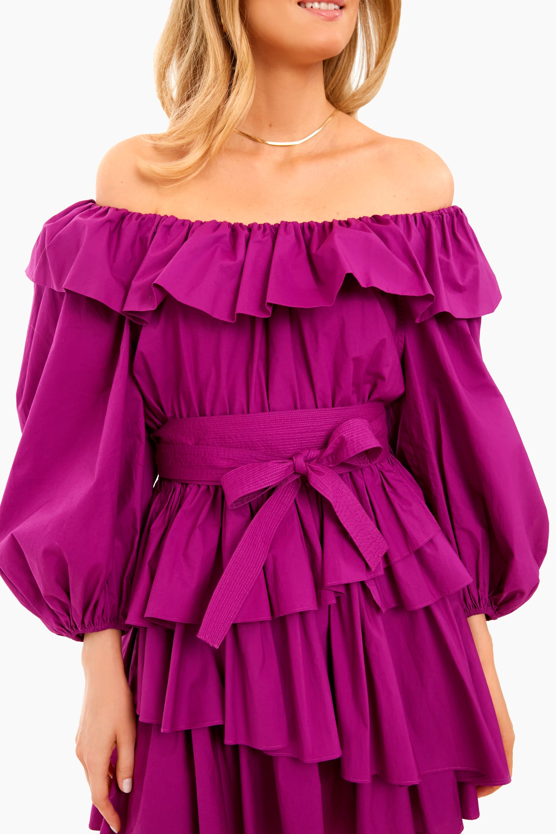 The Orchid Giselle Dress is cut from saturated purple cotton poplin, defined by its ruffled bateau neckline that is layered on top of billowing sleeves that can be worn on or off-the-shoulder. Featuring a comfortable elastic waist, self-tie belt, and asymmetric ruffles adorning the skirt- this mini is an eye-catching, special piece. Add heels and a margarita and you are sure to dance the night away!