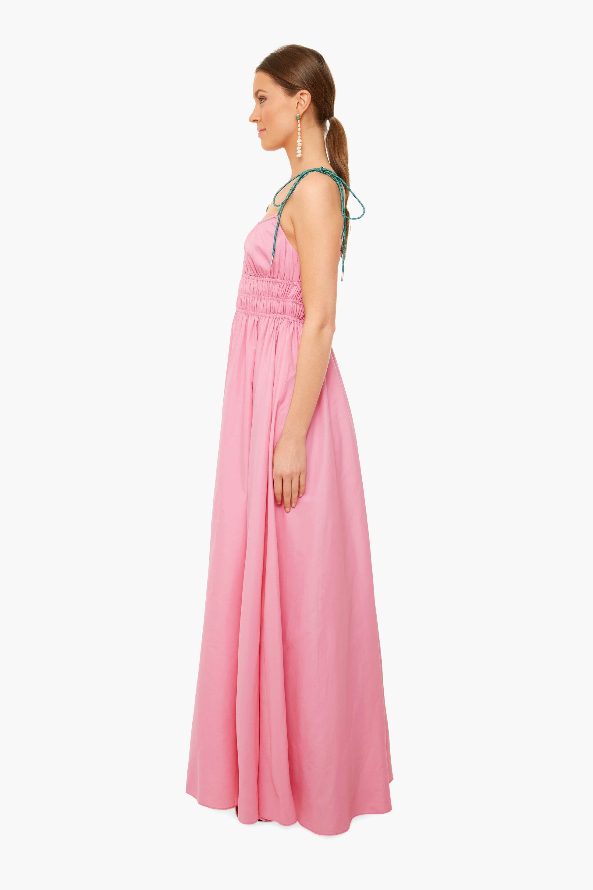 The Petal Sleeveless Bow Dress is a floor length gown with a flattering, elastic smocked bodice. This style features a voluminous maxi skirt and sporty, adjustable rope straps in a contrast color. Add sandals and statement earrings for spring weddings!