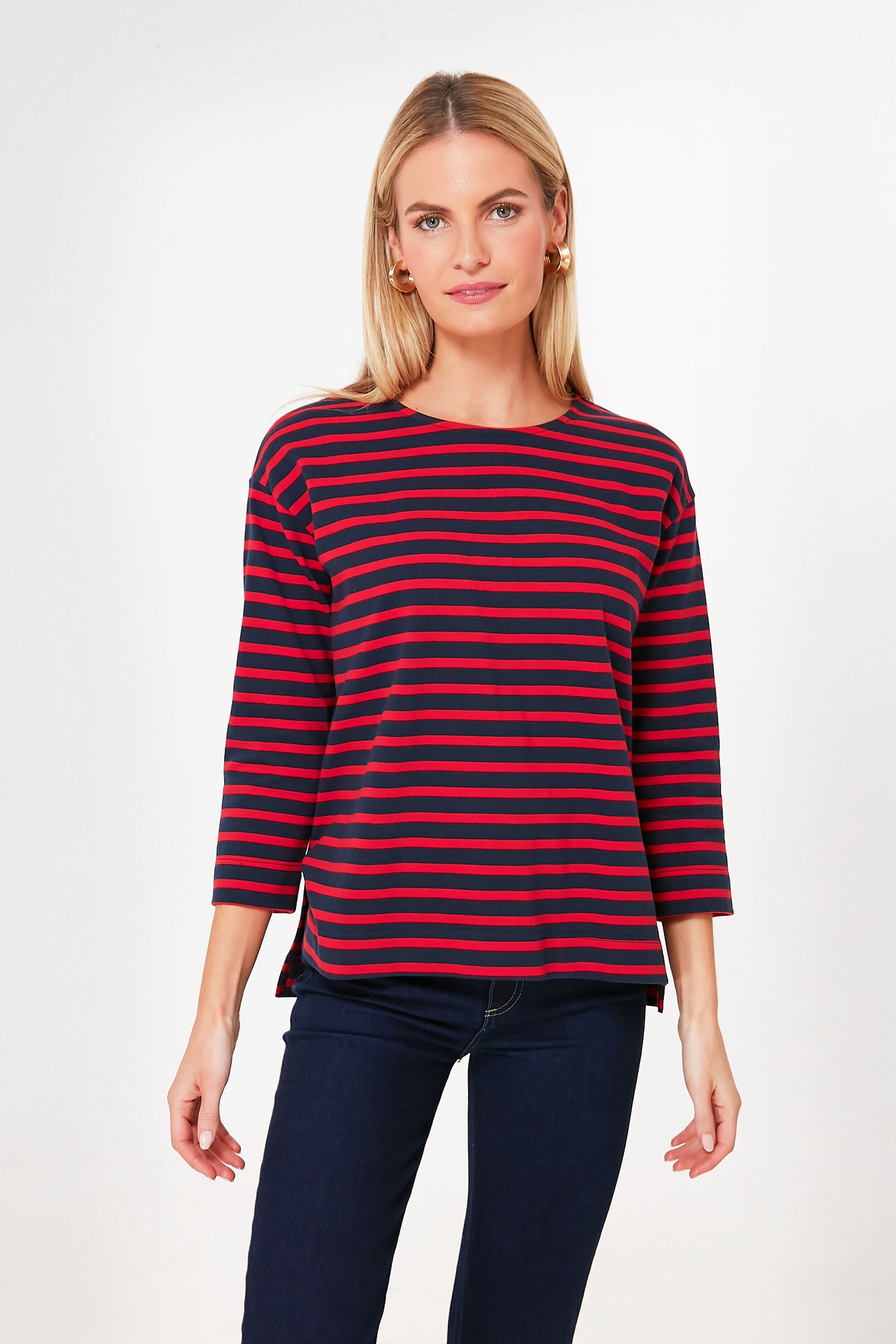 The Red and Navy Stripe Becs Tee is a wardrobe essential known for its oversized fit and high-low hem. Featuring a crewneck and three-quarter length sleeves, this striped top is comfortable and classic. Pair with denim and a woven bag for Parisian-chic style!