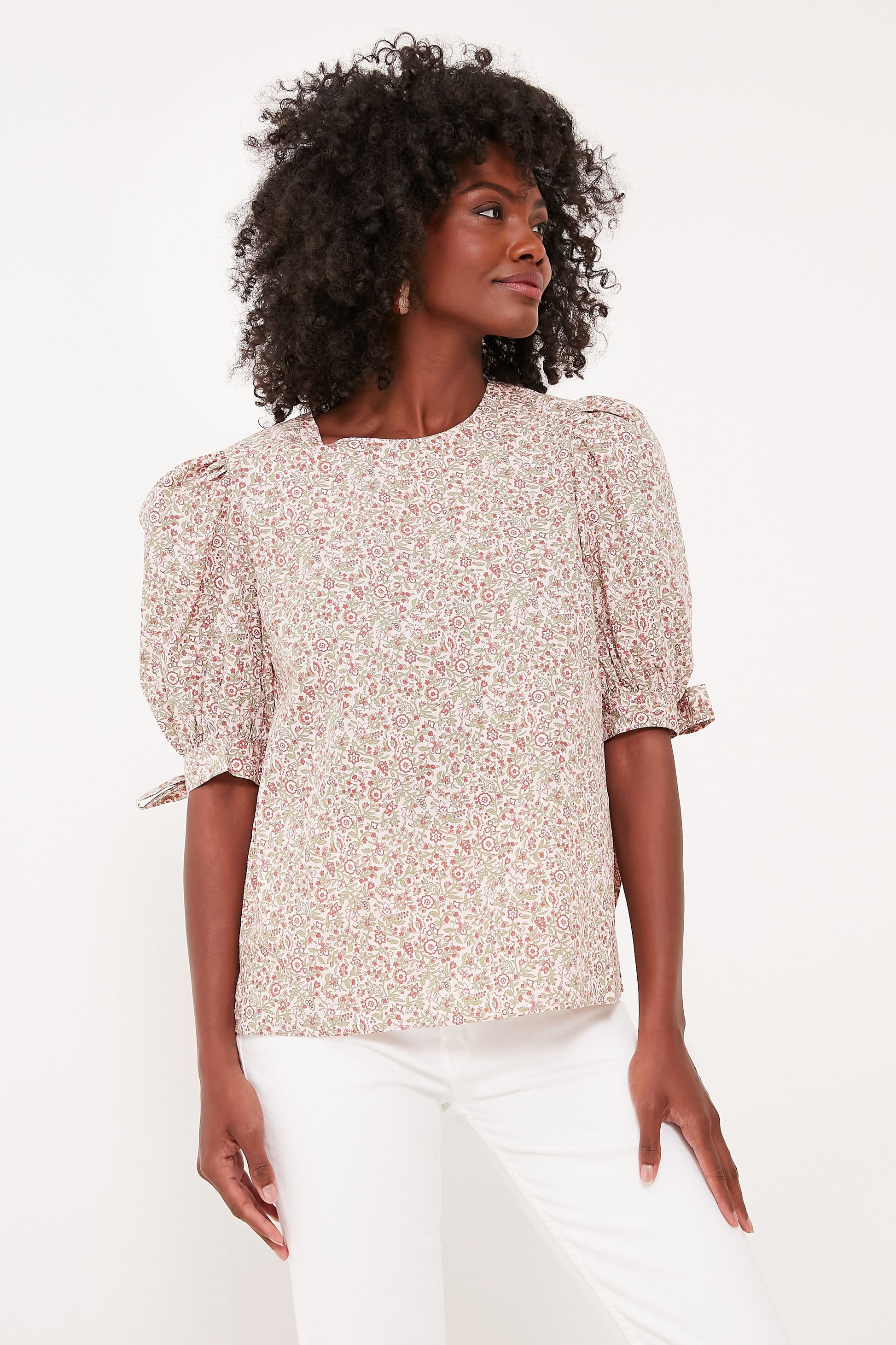 Shades of rosy pink, light green, and red merge together seamlessly to create the ditsy floral pattern of the Fiona Blouse. Ladylike without feeling stuffy and outdated, this multi-toned botanical top features puff sleeves with bow tie details, a keyhole back, and a neckline just begging to be accessorized. We're pairing with crisp white jeans and raffia accessories for a casual yet chic ensemble.