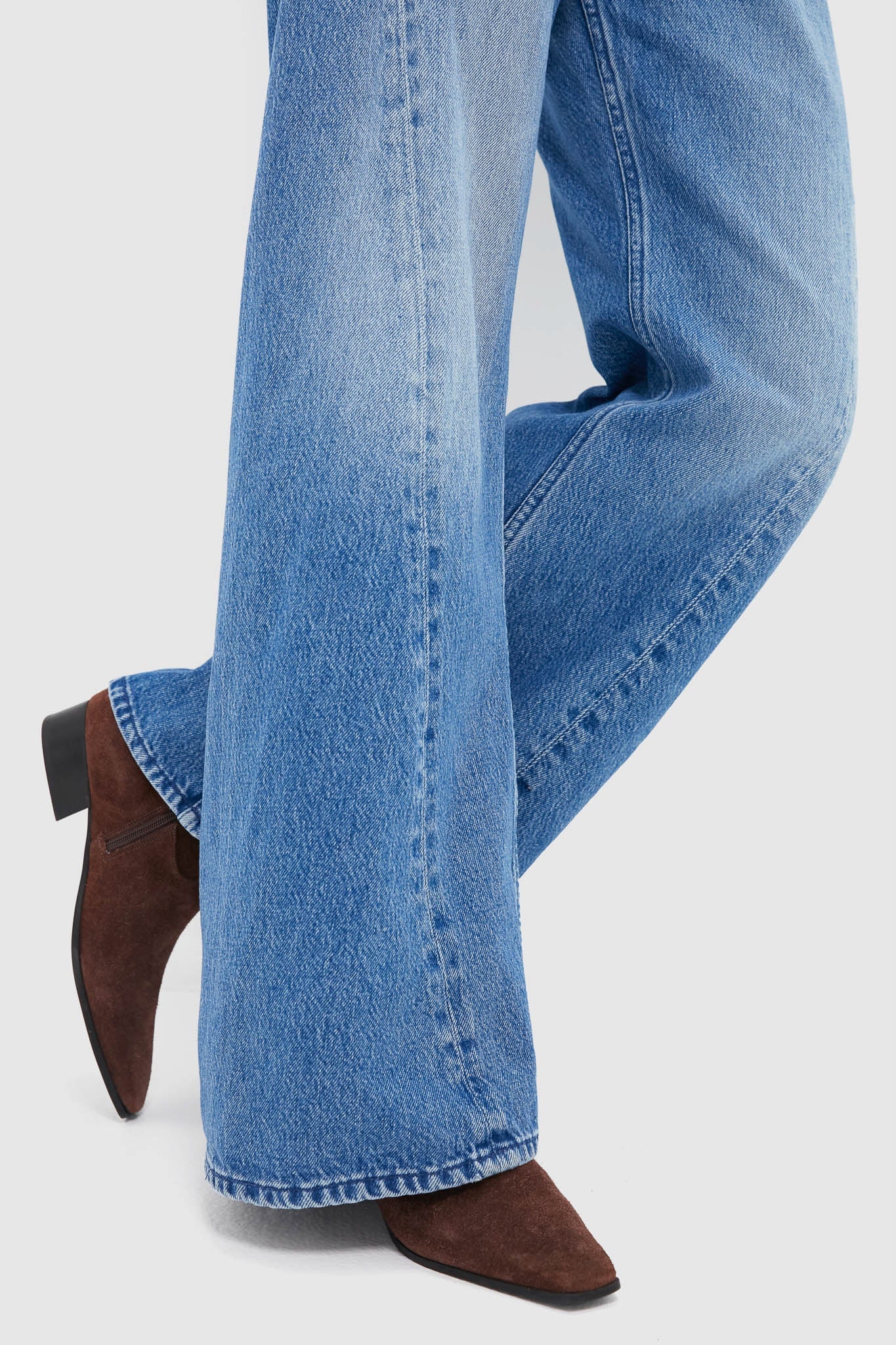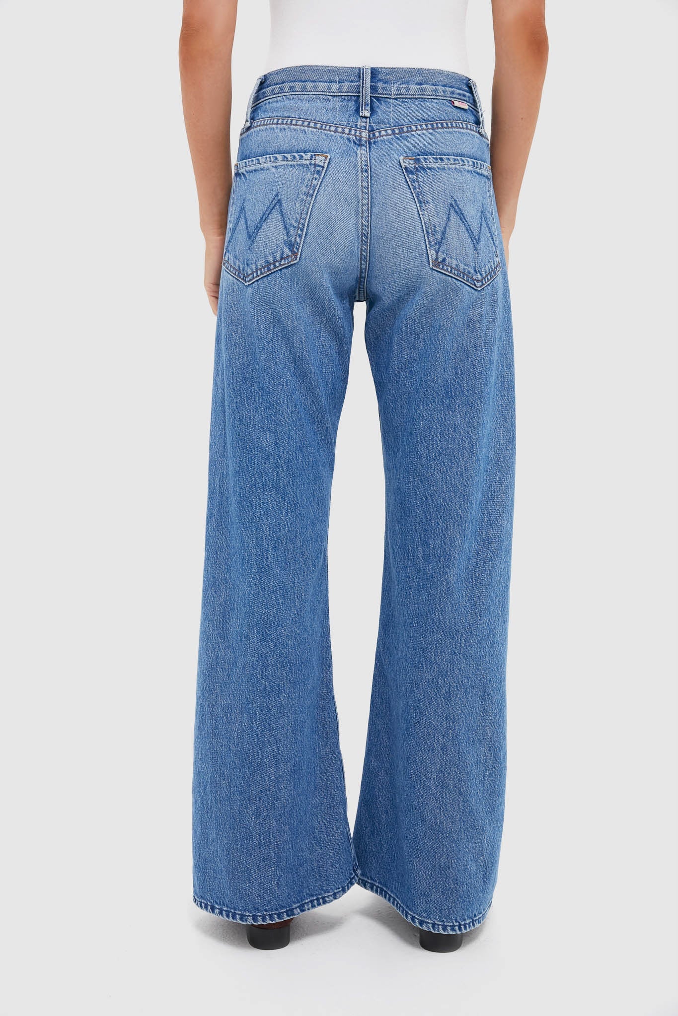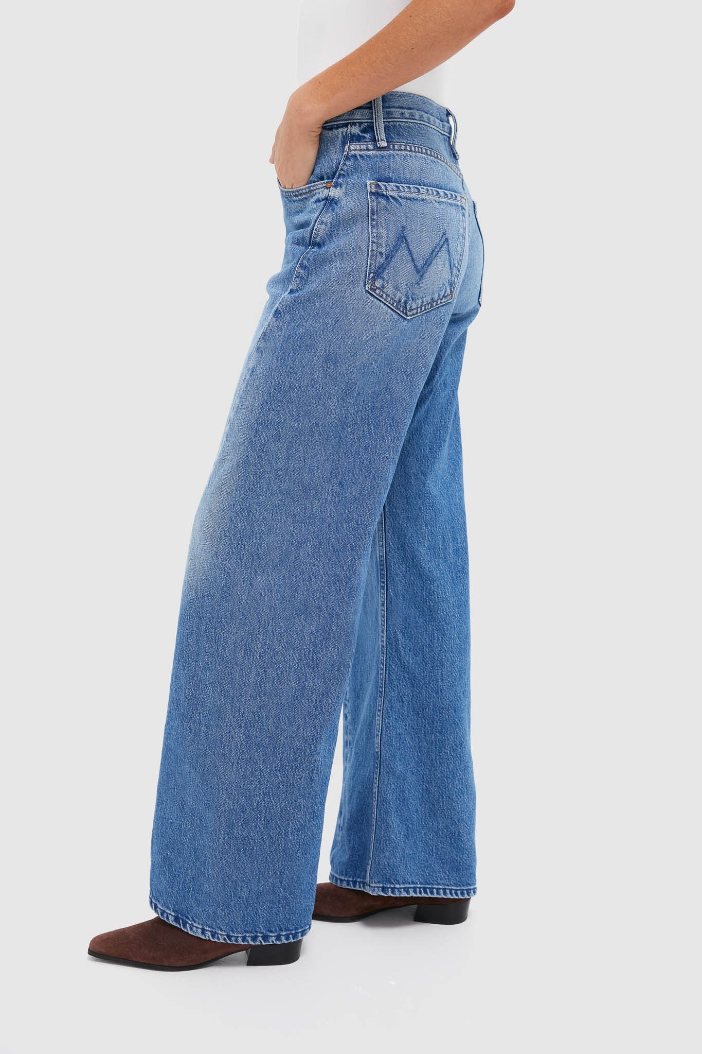 These super high-waisted jeans have a loose wide leg with a curved outer seam and a long inseam with a clean hem. Made from a rigid recycled cotton blend, Rolling In The Dough is a mid-blue with a pretzel-detailed button and candy-inspired interior rivets. Pair with tees, buttons downs, and sweaters, this versatile pant is sure to become a favorite in no time.