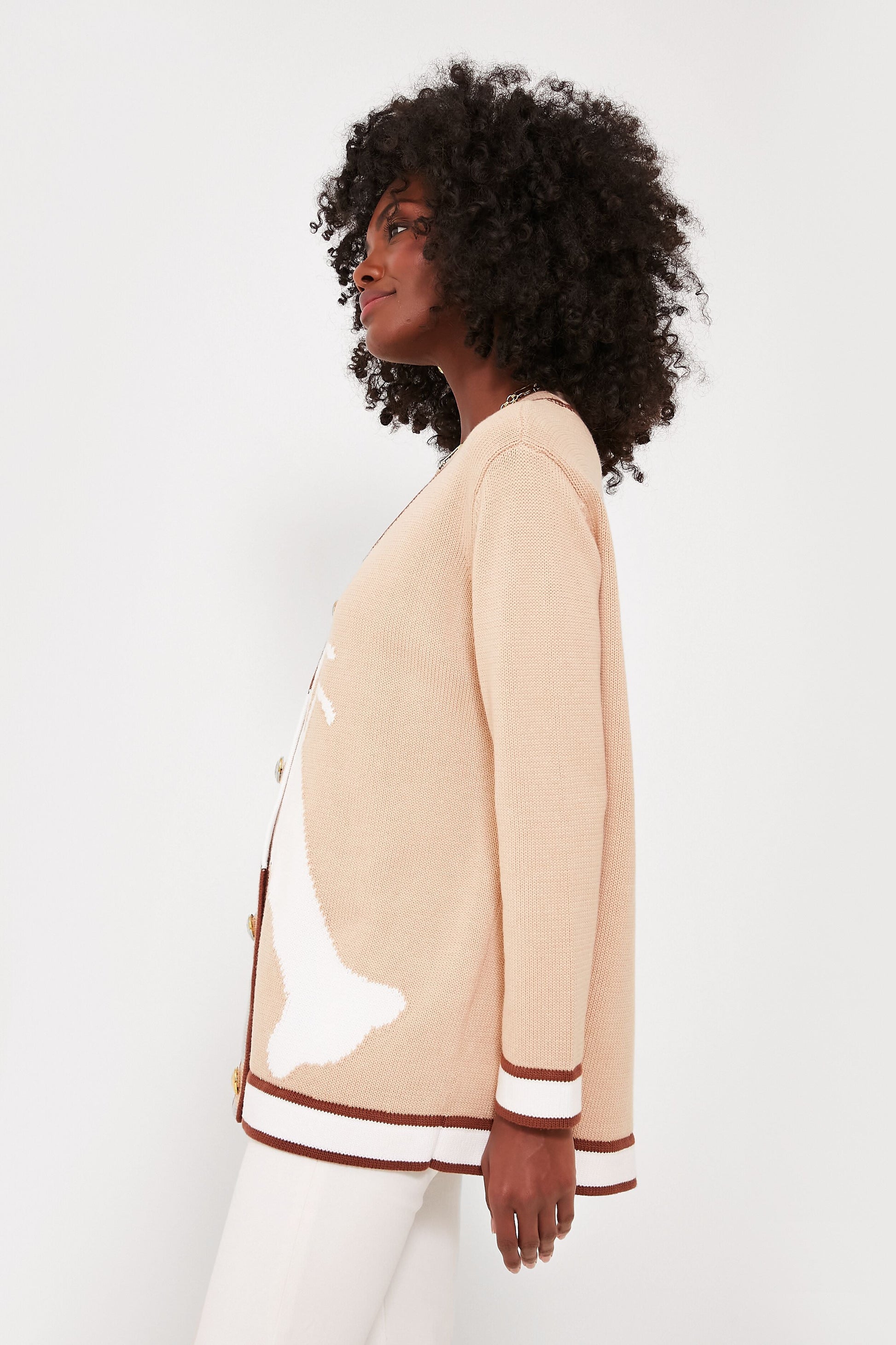 The Lauren Cardigan gets an East Coast update with its oversized lobster motif upon a creamy khaki backdrop. Inspired by your grandfather's classic cardigan, this traditional silhouette combines a cozy oversized fit with feminine tailoring in a not-too-light, but not-too-heavy cotton for the ideal layering piece for the season. Detailed with gold buttons, a preppy print, and deep front pockets, this is the perfect combination of relaxed yet put-together.
