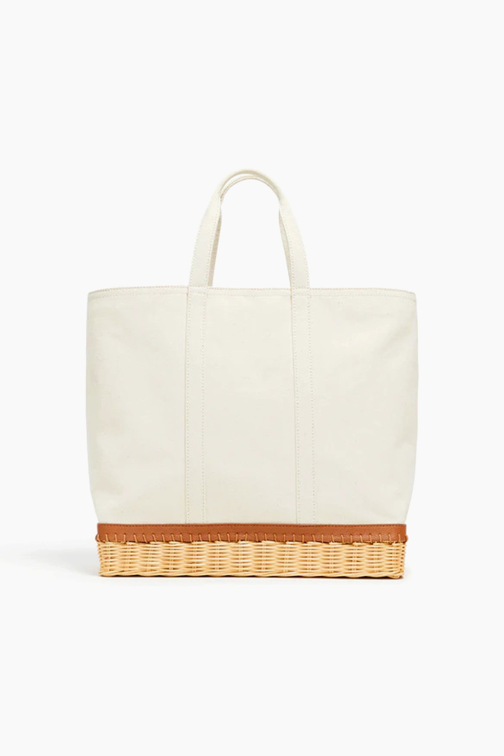 • A forever-favorite, the Gardner Tote elevates the classic cotton canvas style with a handwoven rattan base and leather whipstitch trim. Always chic, it is perfect for your next sunny getaway, days at the pool, boat rides, and dinners al fresco.