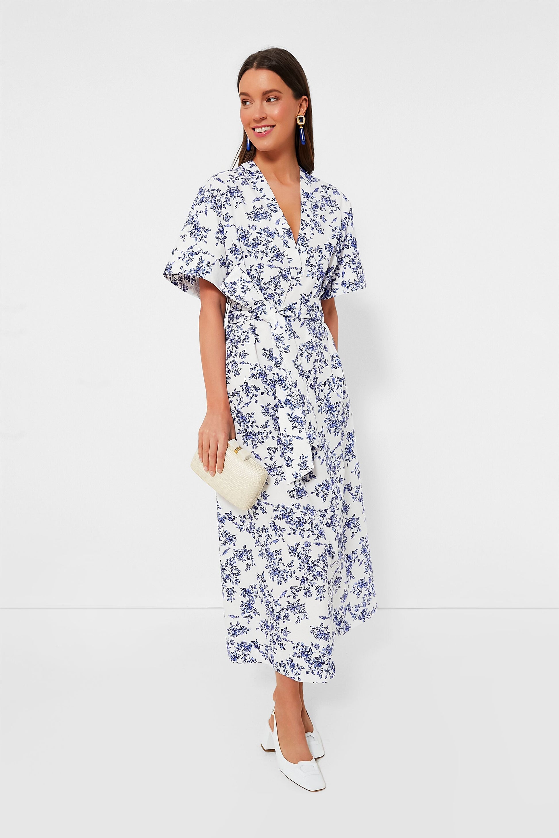 An exquisite piece of sunshiny apparel, the Vintage Rose Blue Ankita California Poplin Dress is a favorite of ours. Made of lightweight cotton, it is adorned with a beautiful blue floral motif and is finished with an elegant V-neckline and a self-tie belt offering a flattering fit. Perfect for oceanside lounging, strolling around the resort, and grabbing a cocktail at the beach bar, this breezy silhouette is full of carefree elegance. Finish with sandals and a sunhat to go casual or wedges and raffia earrings to transition into evening.